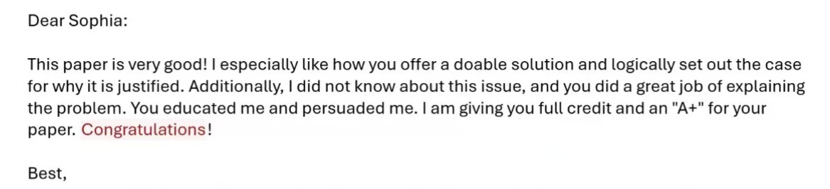 回想起来,我并不是去“表现自己比别人强”,而是去回应一种内心的渴望、去看到更多人、也让更多人看见我。或许,真正的跨文化交流并不在于学会更多slang,而在于一种由内而外的开放感:你愿意去倾听、去理解、去承认人与人之间的差异本身就有价值、去相信对方也愿意包容这些差异。而这时我想要提到我们Advocacy & Debate的第一个论文作业,那个作业是按照problem/cause/answer/net-benefit结构写一个任意感兴趣话题的两页proposal,而我在思索过后决定选择中国老旧小区改造作为我的核心素材。认真写完论文过后我依然对我这篇文章有些担忧,直到在一个早晨惊喜的收到了: