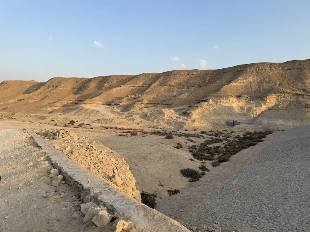 I’ve never been to a desert before. It was entirely different from what I imagined. Under the azure, cloudless sky was a rock; on it carved the text “Wadi Degla Protected Area” in both English and Arabic. Beyond that, the land stretched empty, barren, and endless. The low hills rose on either side in layers of pale stone, glowing faintly gold when the sun touched their edges. For a moment, it felt as if the world had fallen away, leaving nothing but stillness, rock, and sky.