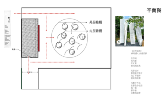 于此,我们只能变化我们的目标。在胡捷老师的建议下,我们打算另辟蹊径在一楼舞蹈教室的旁边建一个又帷幔组成的冥想空间。不一定是出于无奈之举,也不一定是心态上的转变,我只能将此次由实用性到艺术性的改革称之为战略变动。这种变动让我们重新燃起希望,也第一次尝试把冥想和艺术结合在一起。 有了前进目标,我们很快就走出了失落和无力,在专业设计师的指导下开始了冥想艺术装置的设计。首先,我们确认了我们艺术装置的中心立意:立竹知形。立竹知形描绘了一幅当代社会的写意画卷:我们如同共生于一片广袤竹林,风姿各异,并肩而立。 我们得以窥见彼此的轮廓,却难辨他人生活的真实纹理与情感的全貌。这种“影影绰绰”的距离,并非疏离,而是一种必要的边界与呼吸感。这个立意其实来自我们对校园日常的细心观察:大家看似近在咫尺,却常常被无形的墙隔开。 确定了立意之后,我们用设计来尽可能地模拟出竹林的意境:用两米高的矮层帷幔框出范围;用4米高的悬挂的高层帷幔框出个人的范围;地面用仿生地毯点缀。于是,多层的帷幔形成了影影绰绰的效果,确切地表达出了艺术价值,而实用性(隔音,遮光,独立空间)也难免地大打折扣。理想是丰满的,现实是骨感的,学校依旧因担忧其“可实施性”驳回了此提案……冥想社再次丧失了目标。那一刻的沉默比第一次更沉重,大家都明白,单靠创意还不足以落地。